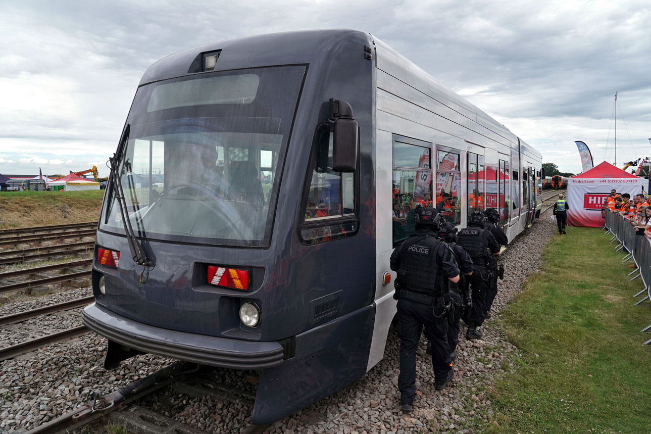 Armed police gently walk past the tram. (All Photographs by Ian Nightingale, 23rd June 2022)