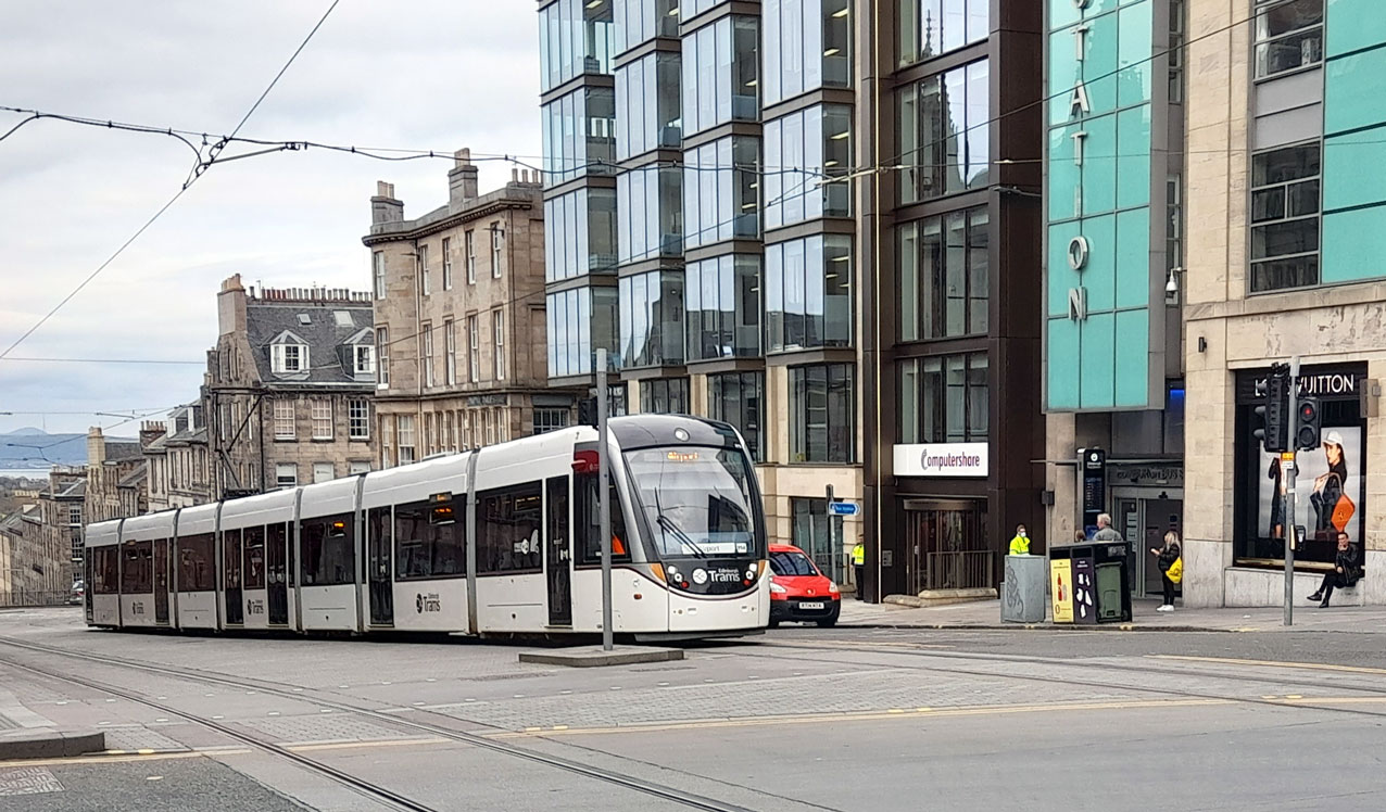 After reversing at York Place crossover tram 275 climbs the gradient from York Place to St Andrew Square to pick up passengers. The Edinburgh bus station entrance is on the right of the picture.