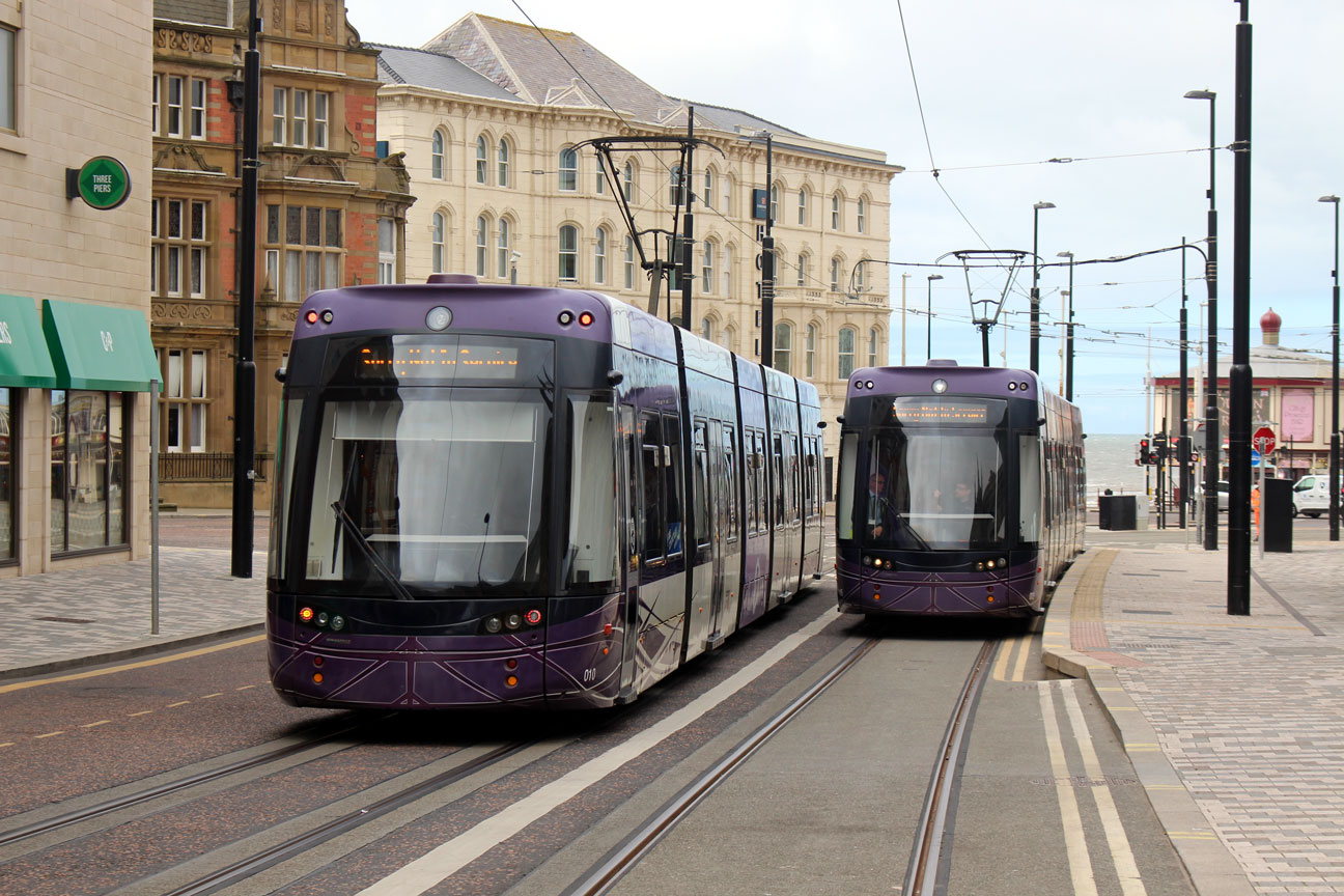 010 and 005 pass on Talbot Road. 005 (on the right) is at the single Talbot Square platform. (Photographs x2 by Tony Armitage, 4th July 2022)
