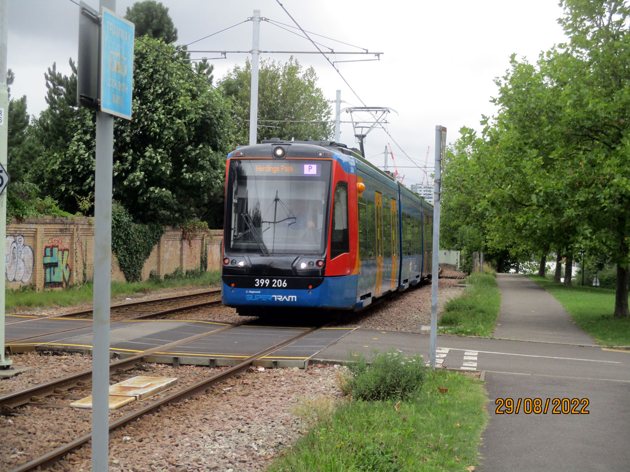 For the majority of the time the hourly Purple route service between Cathedral and Herdings Park is in the hands of one of the original Siemens-Duewag trams but on 29th August there was the relatively rare sight of a Citylink operating the service. In this shot we see 399 206 approaching Park Grange Croft with a service running from the city centre to Herdings Park.