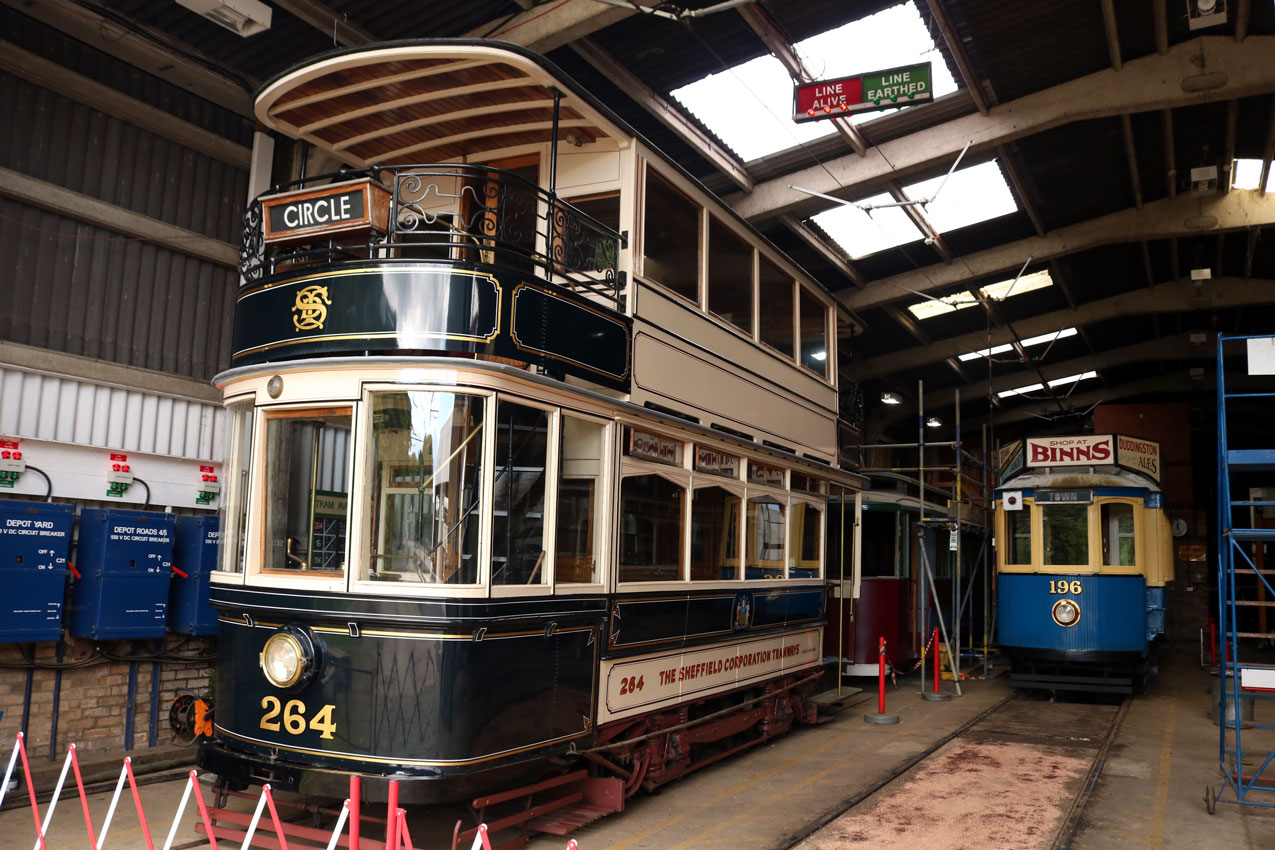 In the depot and 264 remains out of service. Gateshead 10 is behind the Sheffield double decker and Oporto 196 sits alongside.