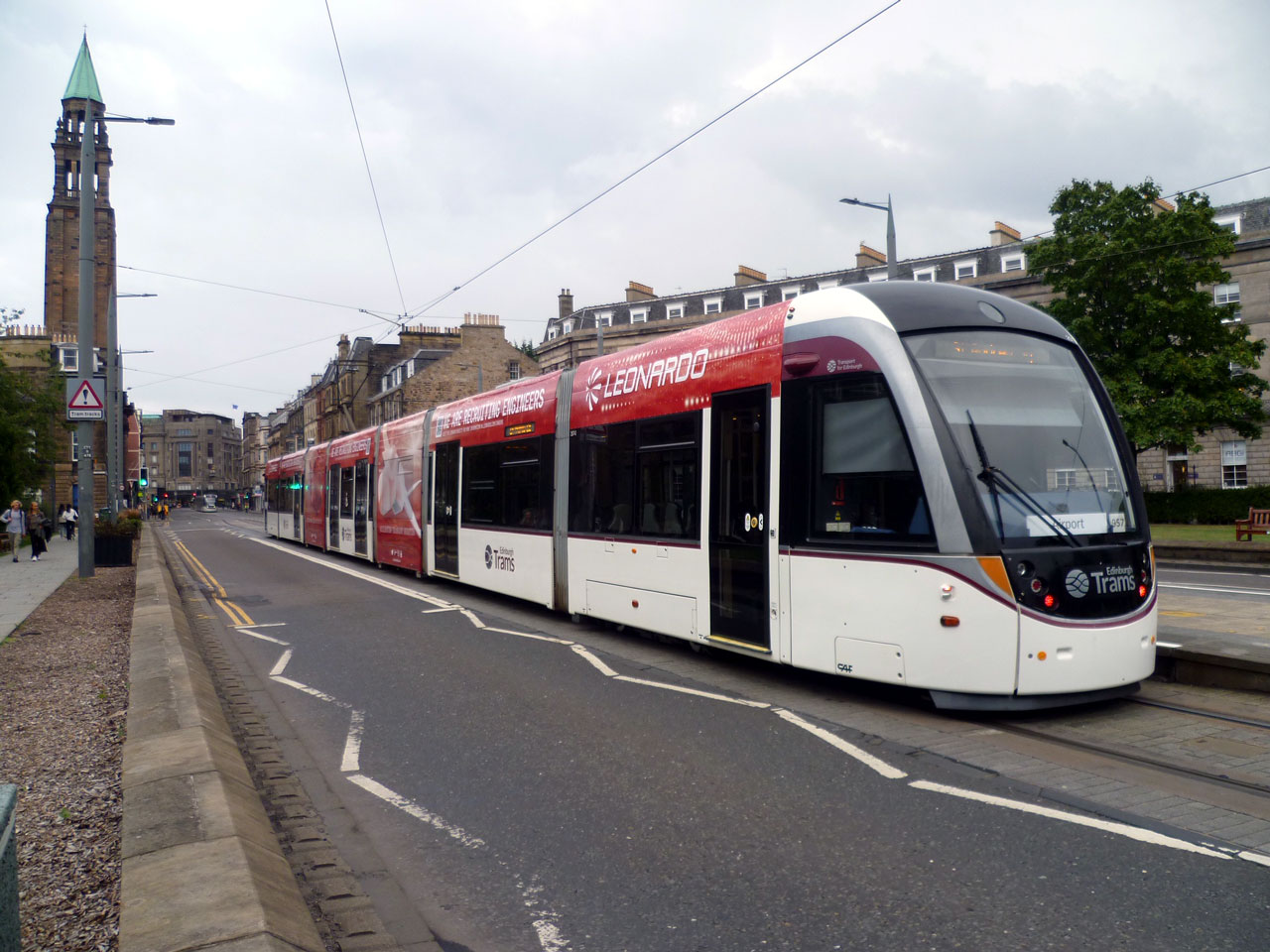 That advert is for Leonardo and is carried by 257. Featuring a red background the advert is seen on the side of the tram here as it moves away from the camera Aat West End to St Andrew Square. The tower of Charlotte Chapel is on the left with the Johnnie Walker Princes Street building immediately to its right at the far end of Shandwick Place. Atholl Crescent, on the right, was the home to the Edinburgh College of Domestic Science from 1891 to 1970 until this was subsumed into Queen Margaret University. (Photograph by Roy Calderwood, 6th September 2022)