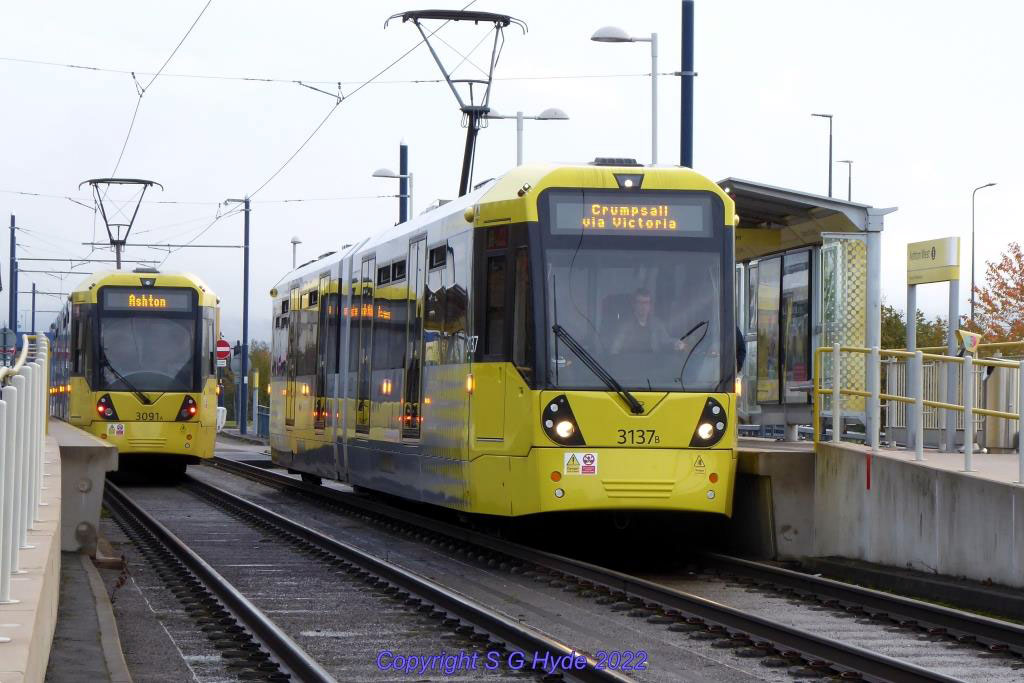 At Ashton West 3137 is also seen on a service from Ashton to Crumpsall. This change of destination is a result of delays to engineering works on the Piccadilly Gardens Delta Junction which mean that there are no services between the Delta Junction and St Peters Square for the next few weeks. Alongside 3137, 3091 is seen departing for Ashton.