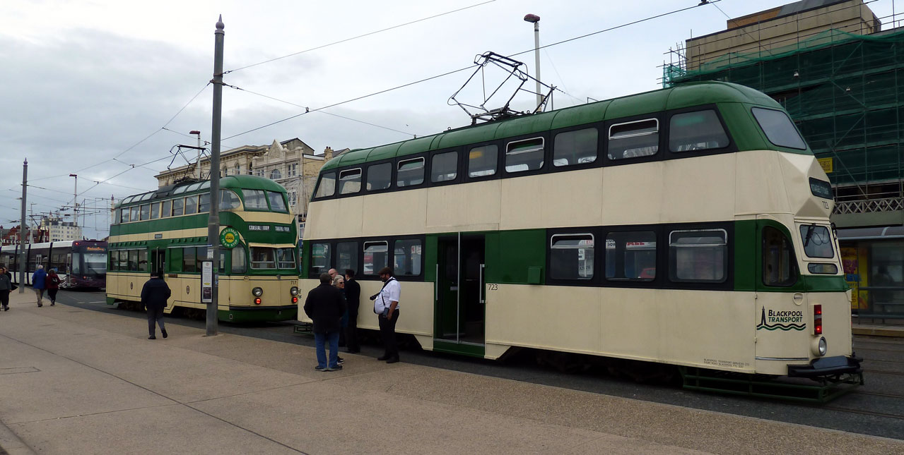 In this photo we see two of the Balloon Cars in the operational heritage fleet which are pausing between heritage tours at the North Pier and Tower heritage stop. Closest to us is 723 with 717 just ahead of it. 717 is about to depart with a Coastal Tour all the way to Fleetwood and then back after a break on the Esplanade. (Photograph by Peter Dockerty, 9th October 2022)