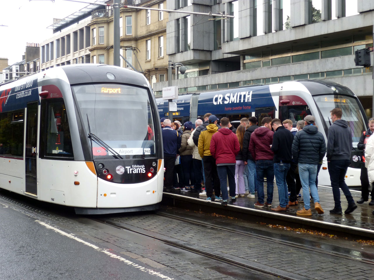 Princes Street was also a busy platform in the lead up to kick-off with a queue for trams leading off the end of the platform. The left hand tram, 265, is heading to Murrayfield and then the Airport whilst 259 is working to St Andrew Square, before long it too will be crammed with fans on the way to the rugby.