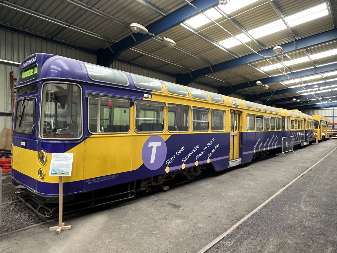 Blackpool Twin Car 674+684 (seen here with trailer leading) last ran on its home tramway in 2008 and retains the Cadbury Blue and Yellow Metro Coastlines it received following a mini-overhaul as the Twin Cars came to the rescue of the Fleetwood service after double deckers were banned due to the condition of the track.