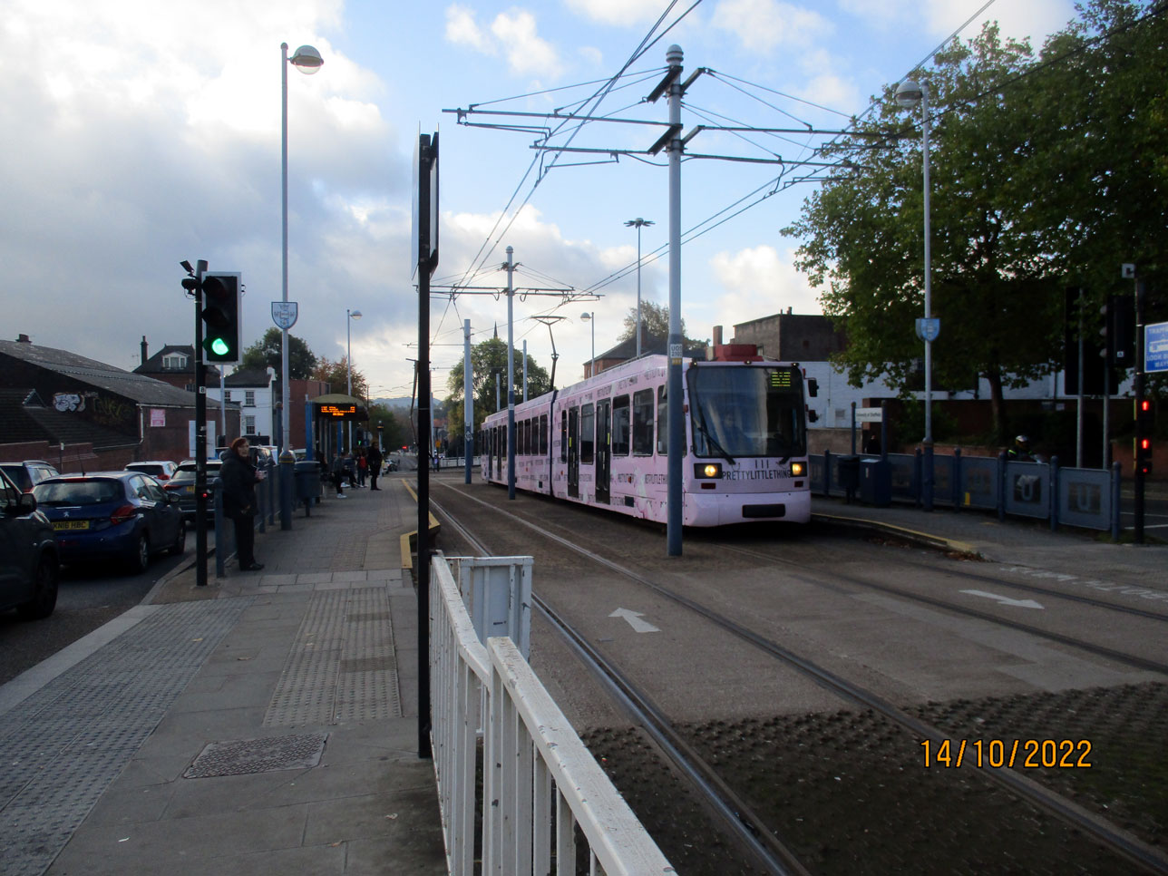 This is 111 – one of the two trams which advertise Pretty Little Thing in Sheffield – which is pausing at the University of Sheffield tramstop with a Yellow route service running from Meadowhall to Middlewood.
