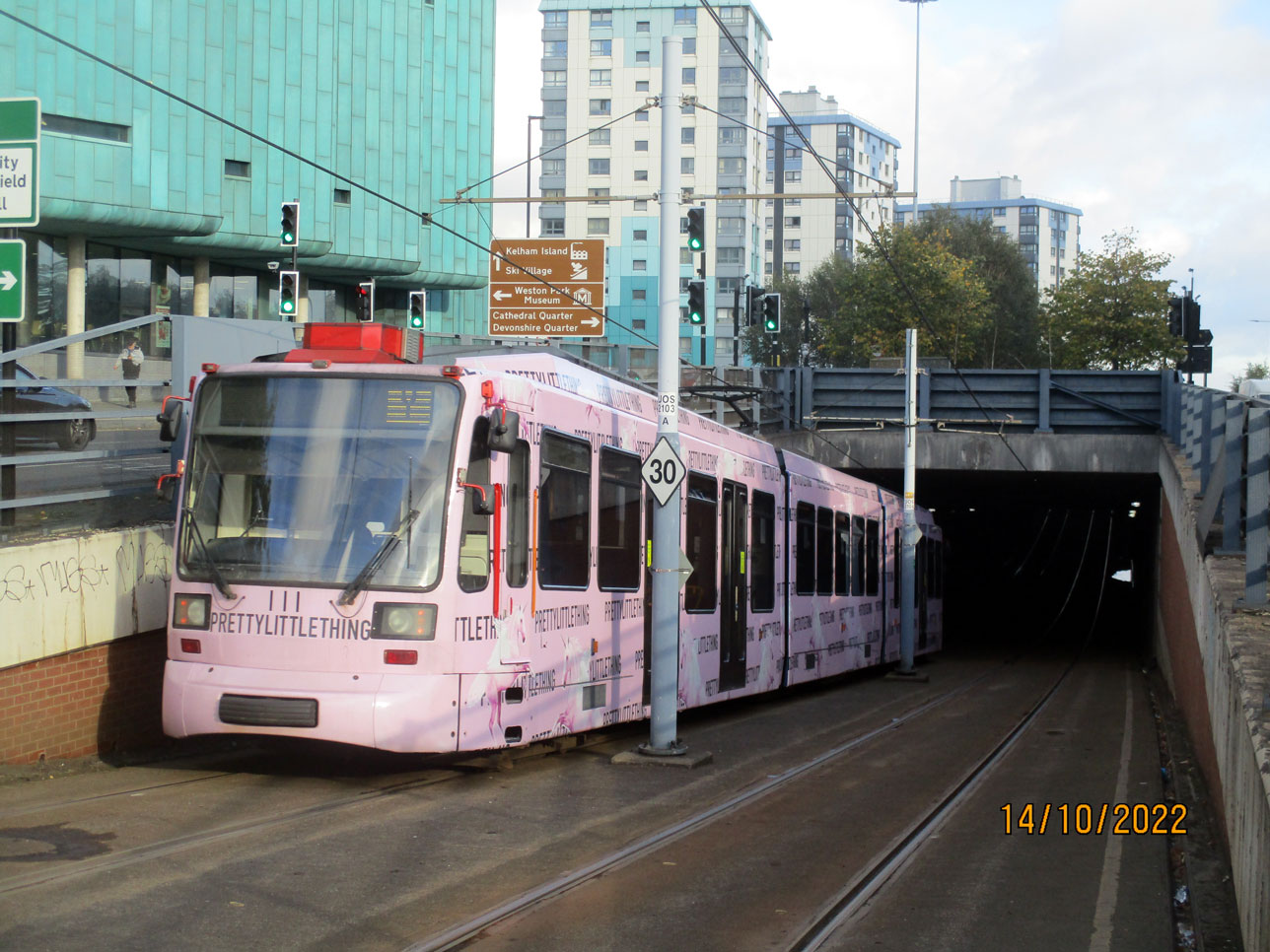 A few moments later and 111 has let passengers off, let some more on and departed from the stop. It now descends to use the underpass which will take the tramway under University Square and then allow it to come back to daylight at Netherthorpe Road.