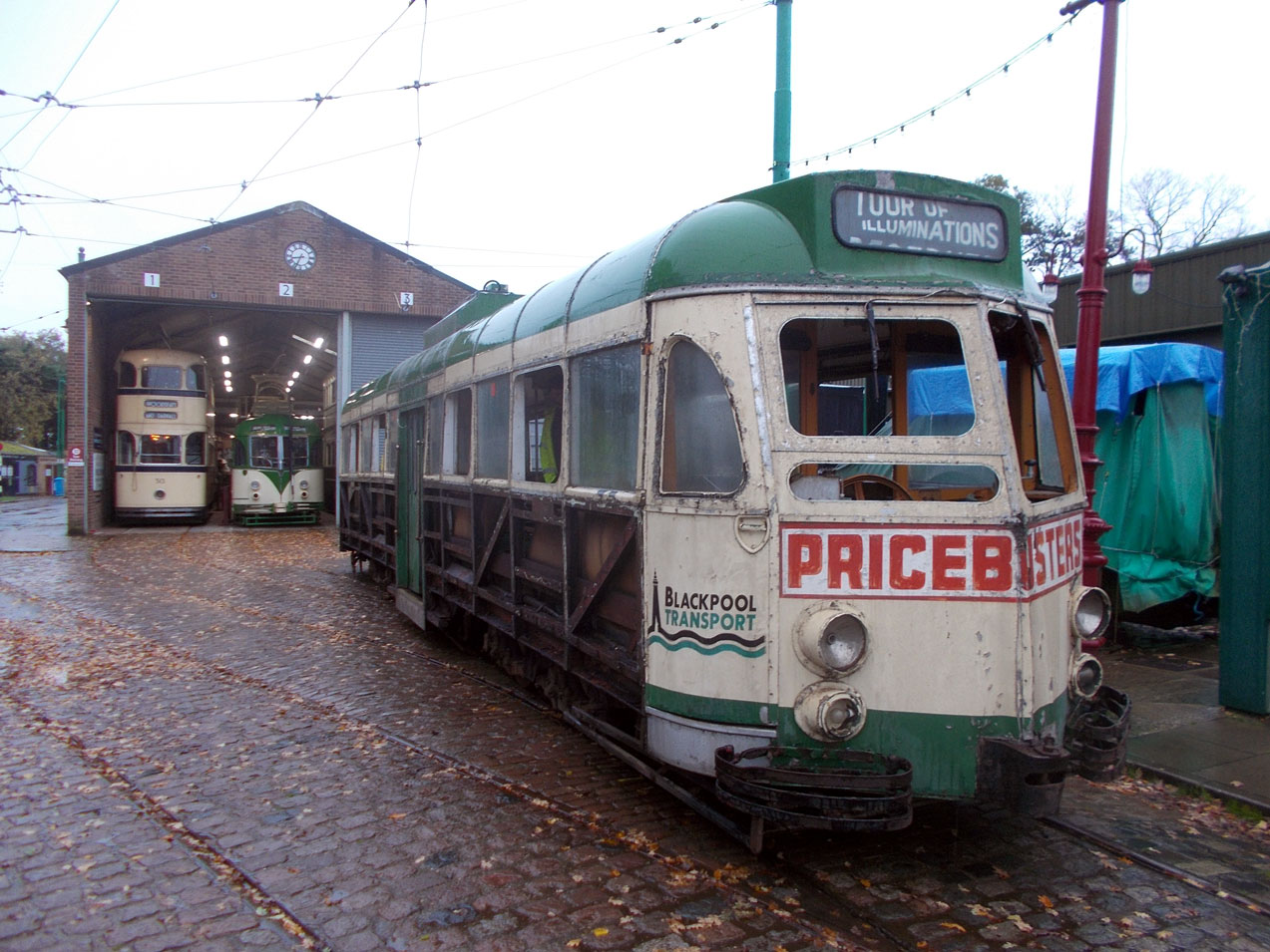 625 meets up with some old friends! Shortly after unloading 625 is seen outside the tram depot. Inside the shed and looking on are Sheffield 513 and Blackpool Marton VAMBAC 11. 625 would have last been with 513 in 2011 but the last time that 11 and 625 were in the same town was way back in 1965!