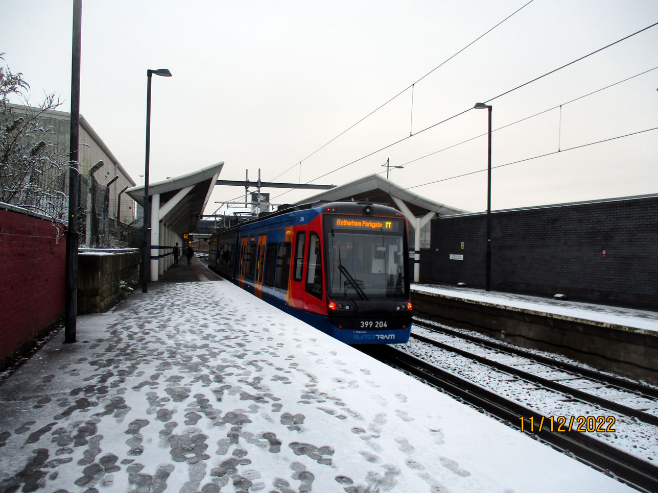 399 204 has now made its way to Rotherham Central and is just departing bound for Rotherham Parkgate. Snow and lots of footprints remain on the platform. (Both Photographs by Stuart Cooke, 11th December 2022)