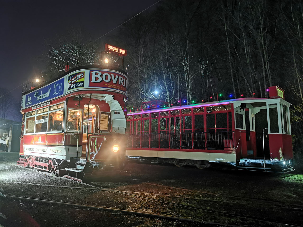 Two open trams in December! Stockport 5 poses alongside 619 at Lakeside.
