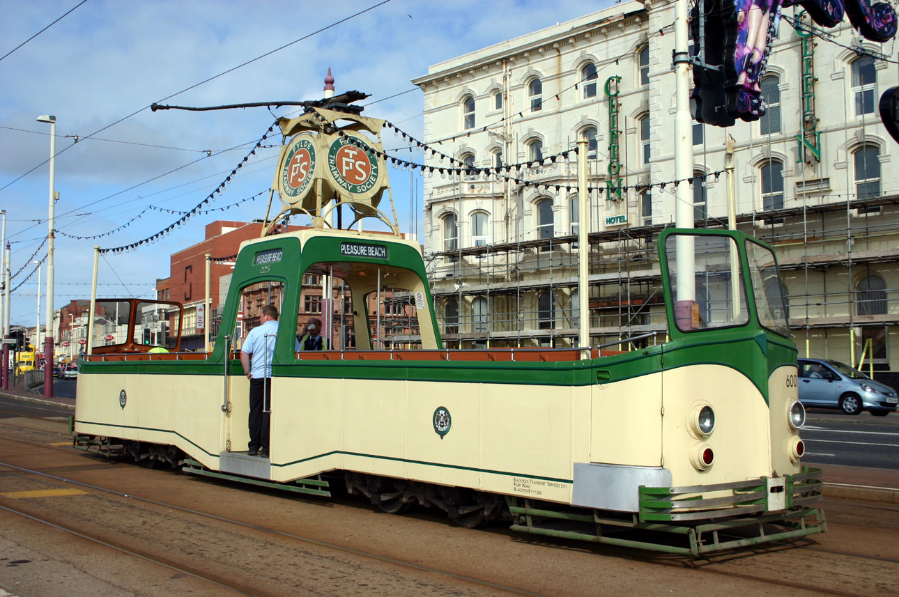 Its 4th September 2007 and the prototype Boat Car, 600, is sitting on the centre track at North Pier when operating specials on a warm late summer’s day. It will soon be departing back south through to Pleasure Beach. The tram had sponsorship from the Fylde Tramway Society and featured its original fleet number above the centre entrances.