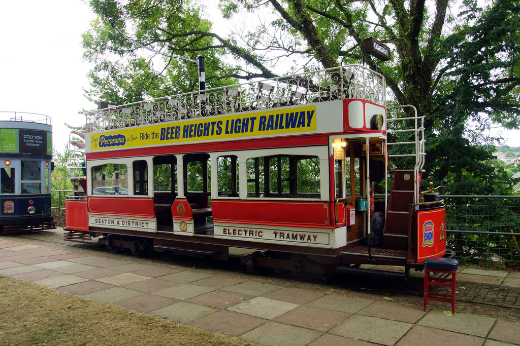 By 26th August 2022 and 2 has now arrived at Colyton (we suspect its arrived there quite a few times in the intervening 15 years though!) and waits at the end of the line. The tram is in the same livery as in 2007 but it has received new between deck adverts for Pecoroma and the Beer Heights Light Railway. (Photograph by David Mee)