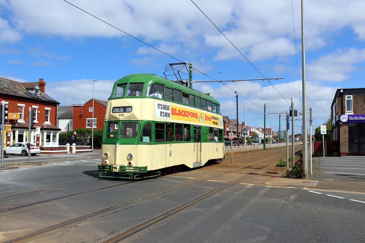 715 is now in a coat of 1970s green and cream fleet livery and is seen here on 3rd June 2022 at Cleveleys when working a Coastal Tour to Fleetwood. The tram – now owned by the Fylde Transport Trust – has an advert for Blackpool Zoo between decks on this side. 2022 would be the last year of operation for this tram with it withdrawn after a farewell tour on 19th November. (Both Photographs by Gareth Prior)