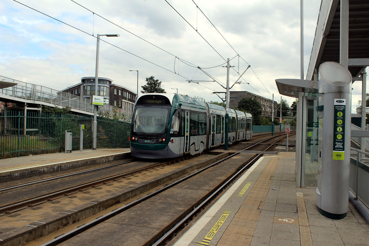 This is a view of the city bound platform with 213 just having departed with a service for Clifton South. We see the curve of the line as it departs the stop towards the city in this shot. Beyond the green fence on the left is the Robin Hood line. (Both Photographs by Gareth Prior, 17th September 2021)