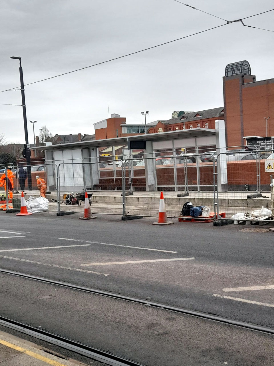 The one intermediate stop is provided on Pipers Row adjacent to the bus station. This shows the railway station bound platform and look closely for on the left there are contractors actually working on the extension!