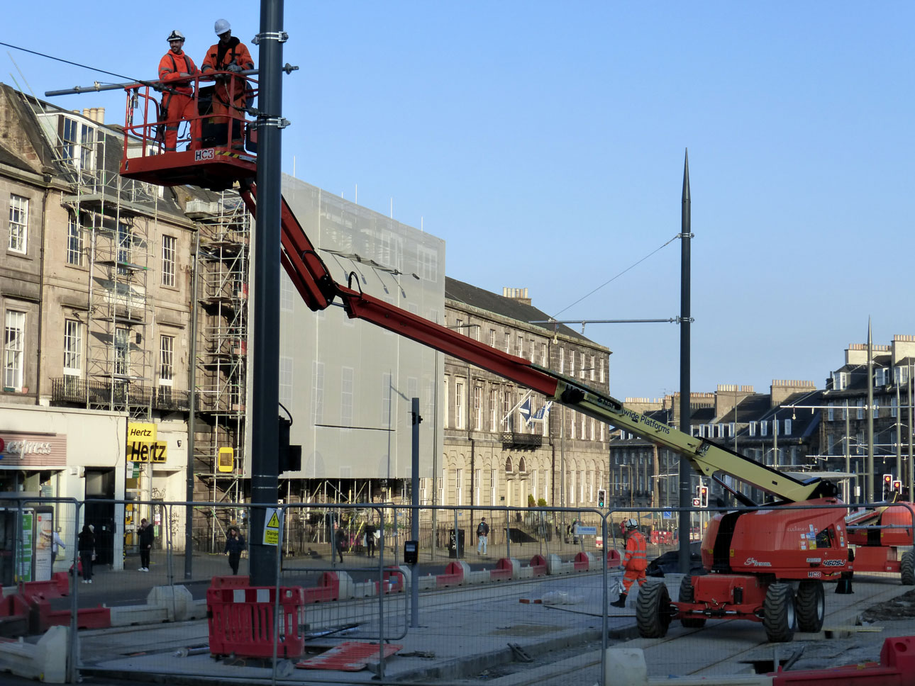 This view is taken in Picardy Place and shows contractors attaching a bracket arm to a traction pole. The new tramstop is to the right of the photo.