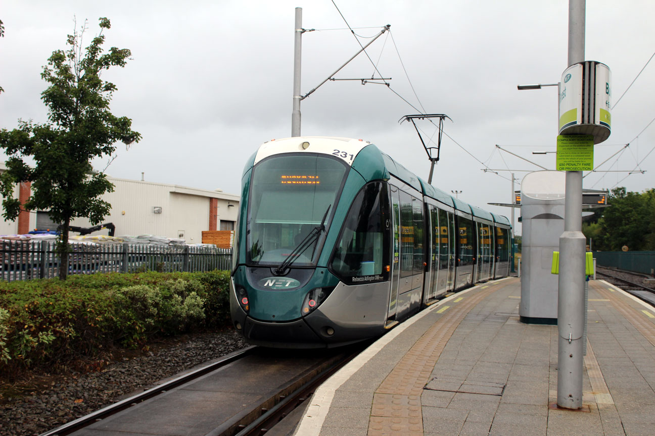 This photo shows the rear of Citadis 231 which is at the Hucknall bound platform. The island platform is in the centre of the image with the citybound track to the right and beyond the green fence is the Robin Hood line.