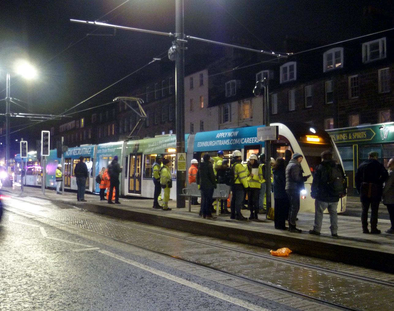 Onwards the tram goes and here has now reached Balfour Street which is the first stop actually located in Leith. There is quite a crowd of people on the stop.