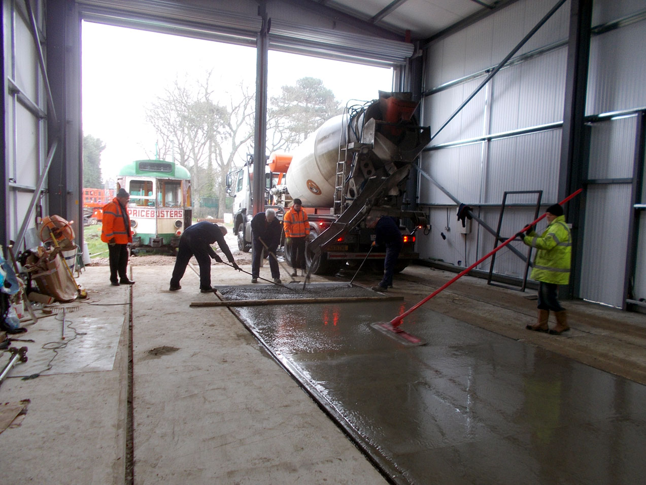 To allow the work to take place Brush 625 was moved out of the depot building and looks on as more concrete is poured. Note the roller shutter doors are raised.
