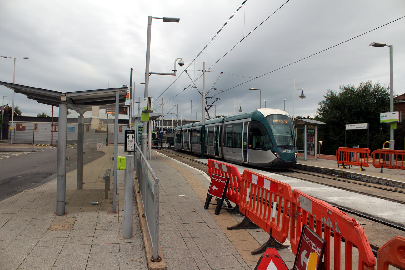At the time of this visit in 2021 there was work being undertaken on the crossing at the city end of the platforms as evidenced by the barriers in the foreground. 216 is standing at the stop ahead of departure to Toton Lane. (Both Photographs by Gareth Prior, 19th September 2021)