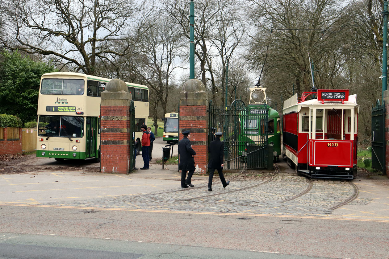 619 (with 623 also just seen) gets ready to say goodbye to the visiting buses at Middleton Road Gates. This is as far as a tram can go out of the Park (at least on track!). Atlantean 353 is just departing and we can also see Delta 133 following behind.