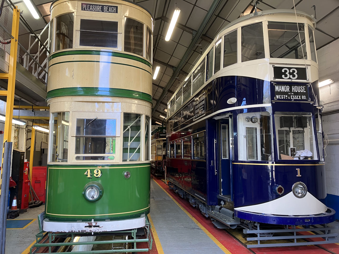 This photo shows Blackpool 49 at the front of the Workshop with London County Council 1 alongside it. Behind the London car we can just make out Newcastle 102. (Photograph by Frank Bagshaw, 2nd April 2023)