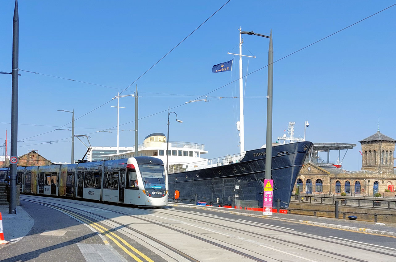 Here we see 267 on Ocean Drive heading towards the city as it approaches Port of Leith stop and passing FINGAL, the former Northern Lighthouse Board tender, now a floating hotel owned by Royal Yacht Britannia.