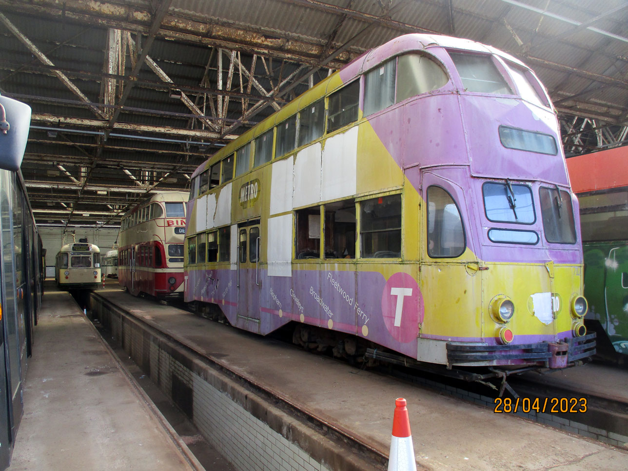 Balloon 710 (“The Alan Bradley Tram”) sits at the front of the depot having arrived back at Rigby Road in February. Behind is Balloon 703 in its guise as Sunderland 101. Twin Car T2+272 is on the left with Coronation 660 at the very back. (All Photographs by Stuart Cooke, 28th April 2023)