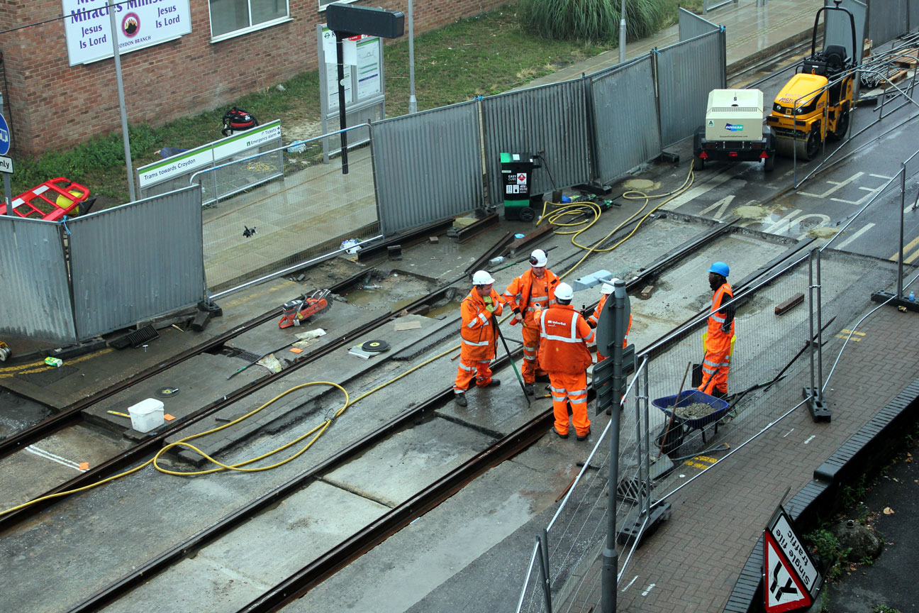 The scene at Reeves Corner on 24th August with workmen in action to replace the tracks.