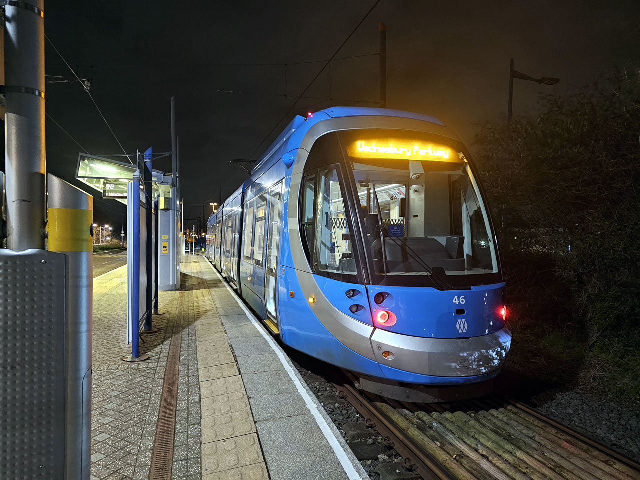 In the very early hours of 25th March that very last tram was to be Urbos100 46. At the end of the day the final services come from either end of the tramway and terminate at Wednesbury Parkway to allow them to return to the depot. This particular service came from Wolverhampton St George’s and we see it here in platform 3 at Wednesbury Parkway where it gets ready to head into the depot. (Photograph by Michael Morton, 25th March 2023)