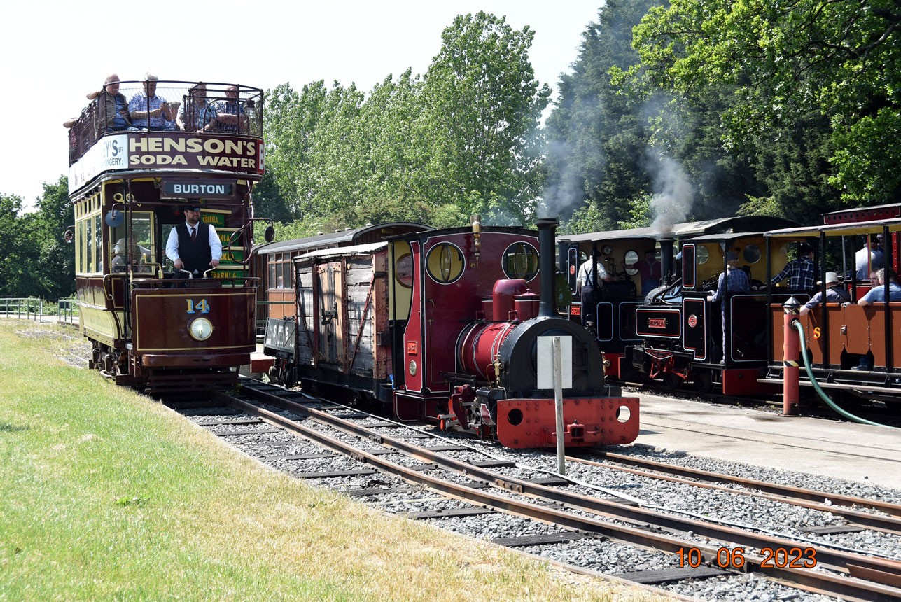 Statfold Barn is probably the only place in the UK at the moment where you can get tram and steam locomotive both in operation together. Here 14 is next to Jack – this is a Hunslet 0-4-0WT built in 1898 and runs on an 18” gauge. Then on the far side it’s a 2 foot gauge line with two former Penrhyn Slate Quarry locos – Cegin and Marchlyn.