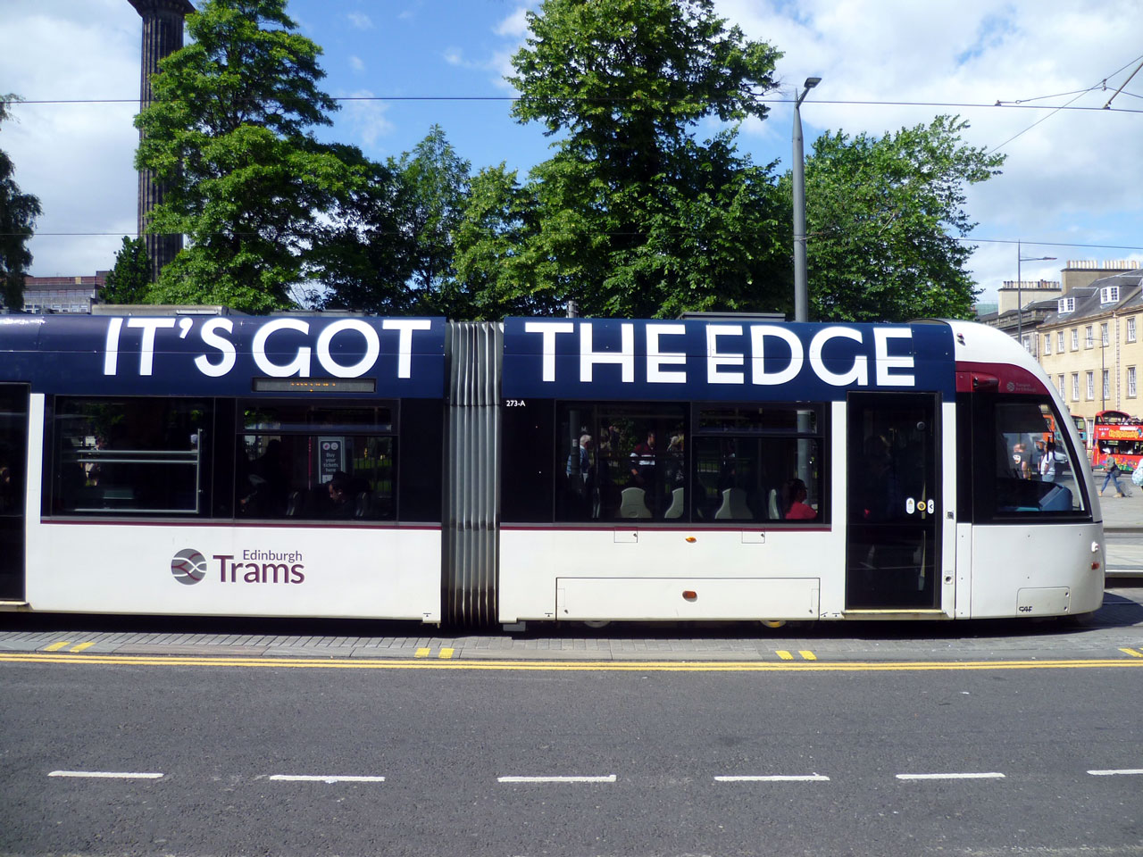 A close-up view of one end of the tram showing the dark blue now used as the base of the ad.