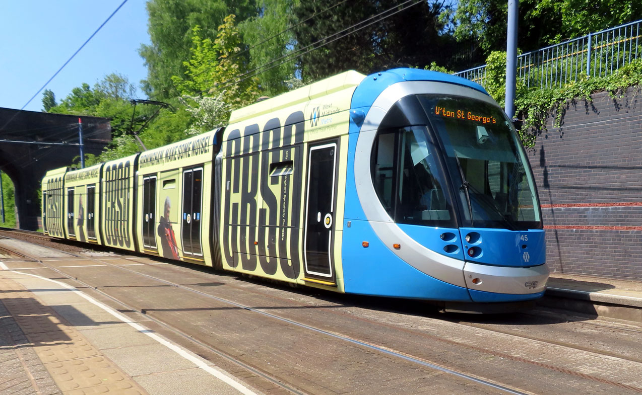 The first of those trams is 45 which shows off its advertising livery for the City of Birmingham Symphony Orchestra as it pulls into the stop. This yellow advert was stuck on the tram in April 2023.