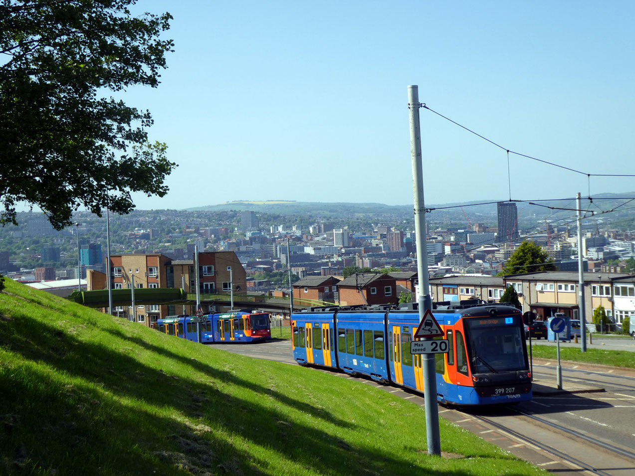 Much of the Supertram network was built with steep gradients and this is no more apparent than on the Blue route in the Park Grange area. With the steep slopes here it gives some excellent photo opportunities and on this occasion there was an added bonus as trams passed heading in opposite directions. The aim was to get a tram heading out of the city towards Halfway and that was 102 which we see climbing towards us. But just as that was happening 399 207 is going the other way to provide two trams for the price of one in one photo! (Photograph by John Whittingham, 24th May 2023)