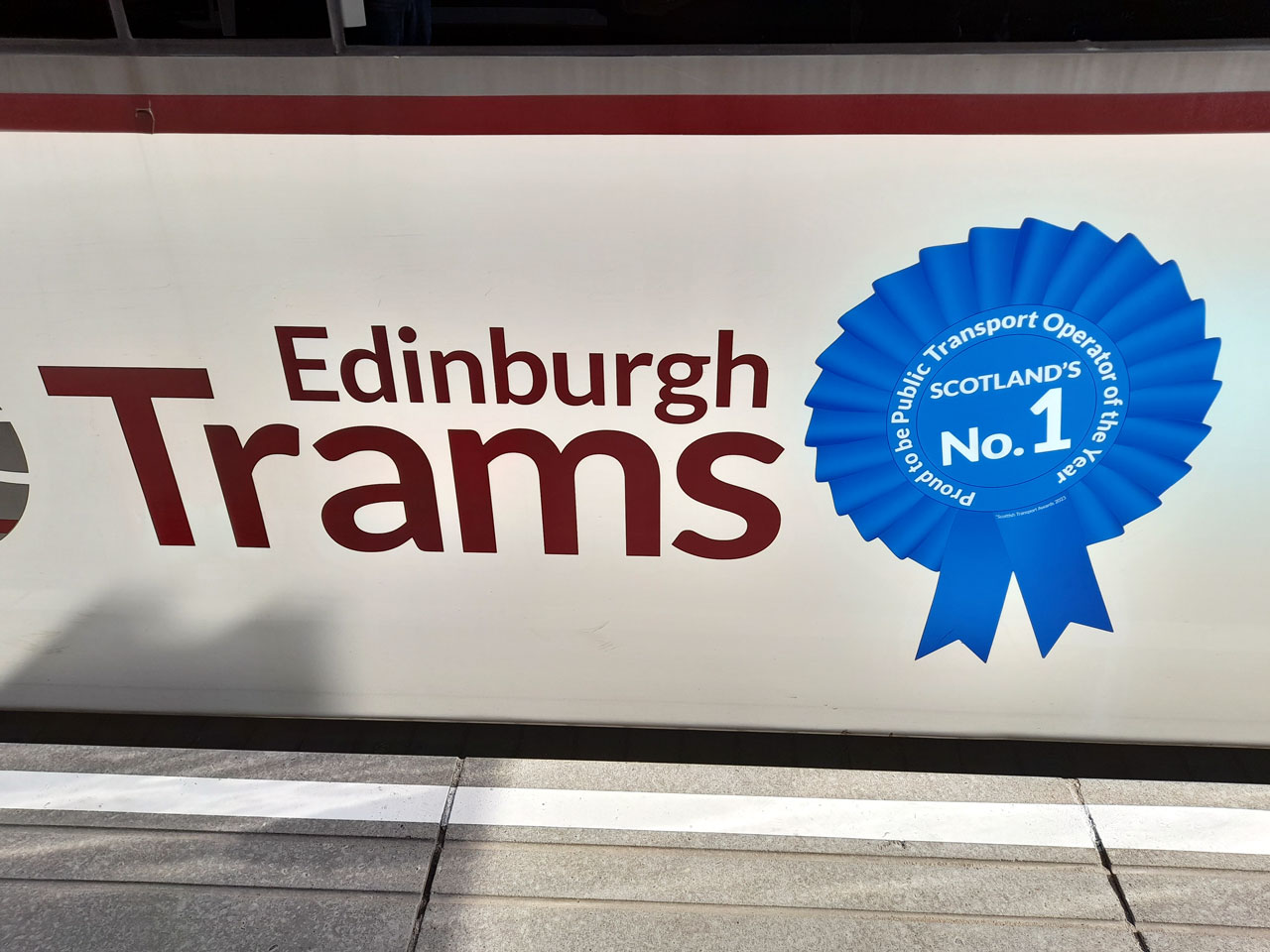 More of the detail of the rosette showing that Edinburgh Trams are “Proud to be Public Transport Operator of the Year” and that they are “Scotland’s No. 1”. (All Photographs by John Hampton, 27th July 2023)