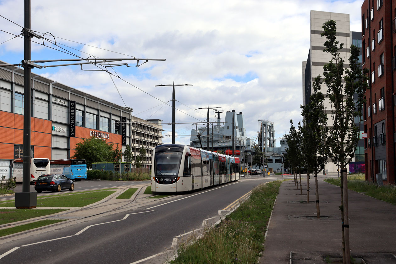 255 approaches Ocean Terminal with a service to Newhaven. Ocean Terminal shopping centre to the left. The crossover mentioned in the text above is about to be passed by the tram. (Both Photographs by Gareth Prior, 2nd July 2023)