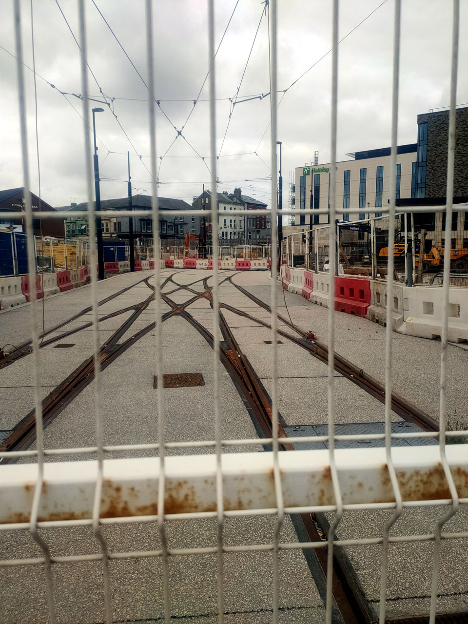 Looking through the fences at the Dickson Road end of the building site towards the tram terminus. Trams have run on these tracks but its now over 12 months since they did and since then the construction works on the hotel have meant any progress with the tramway has well and truly stalled. The new Holiday Inn now dominates the site on the right and looks as if externally at least it is nearing completion. The scissors crossover allowing trams to access either side of the island platform are in the foreground. (Photograph by Mark Cufflin, 28th August 2023)