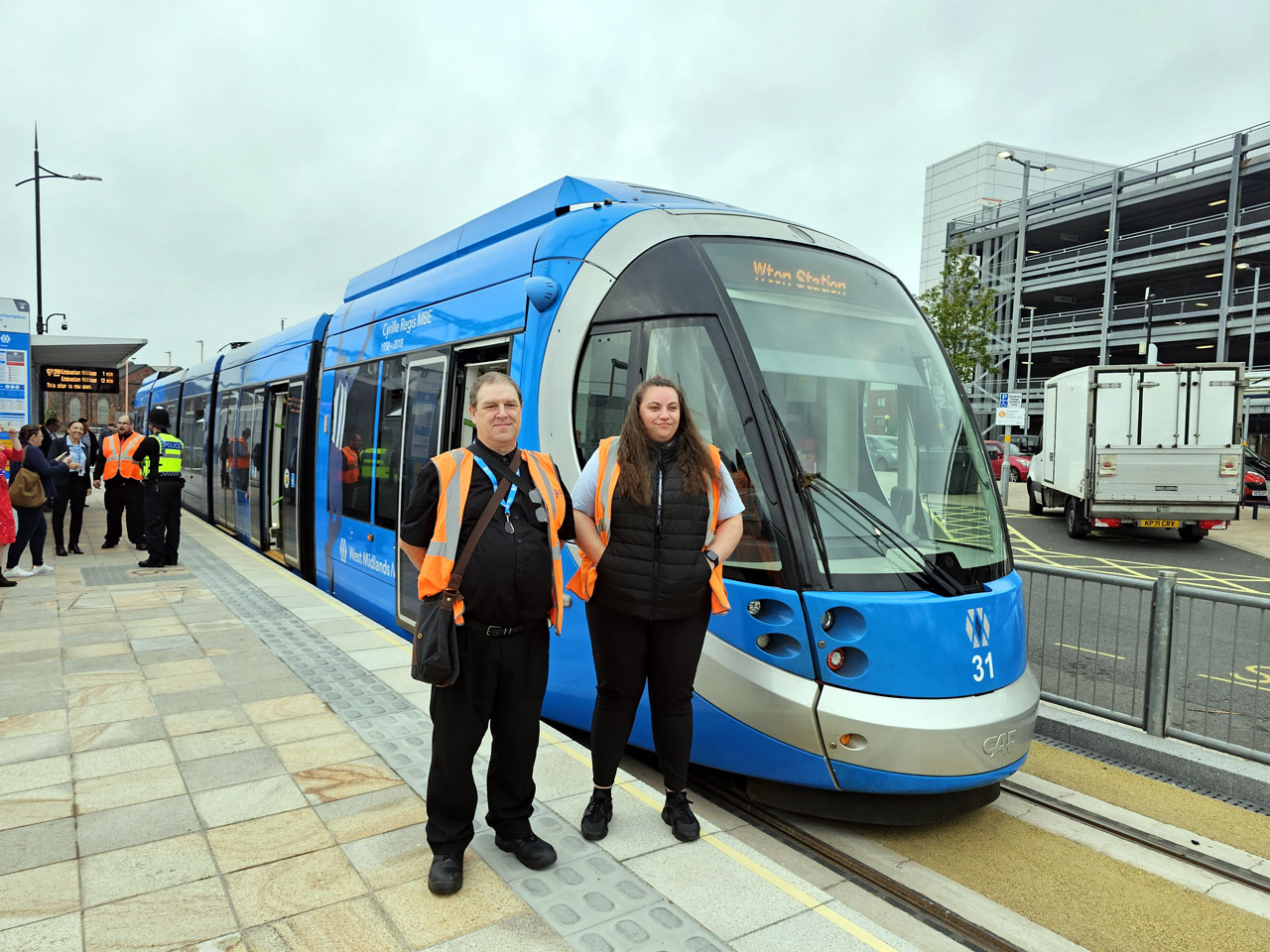 The crew of the first tram pose alongside having arrived at Wolverhampton Railway Station. (Photograph by Michael Morton, 17th September 2023)