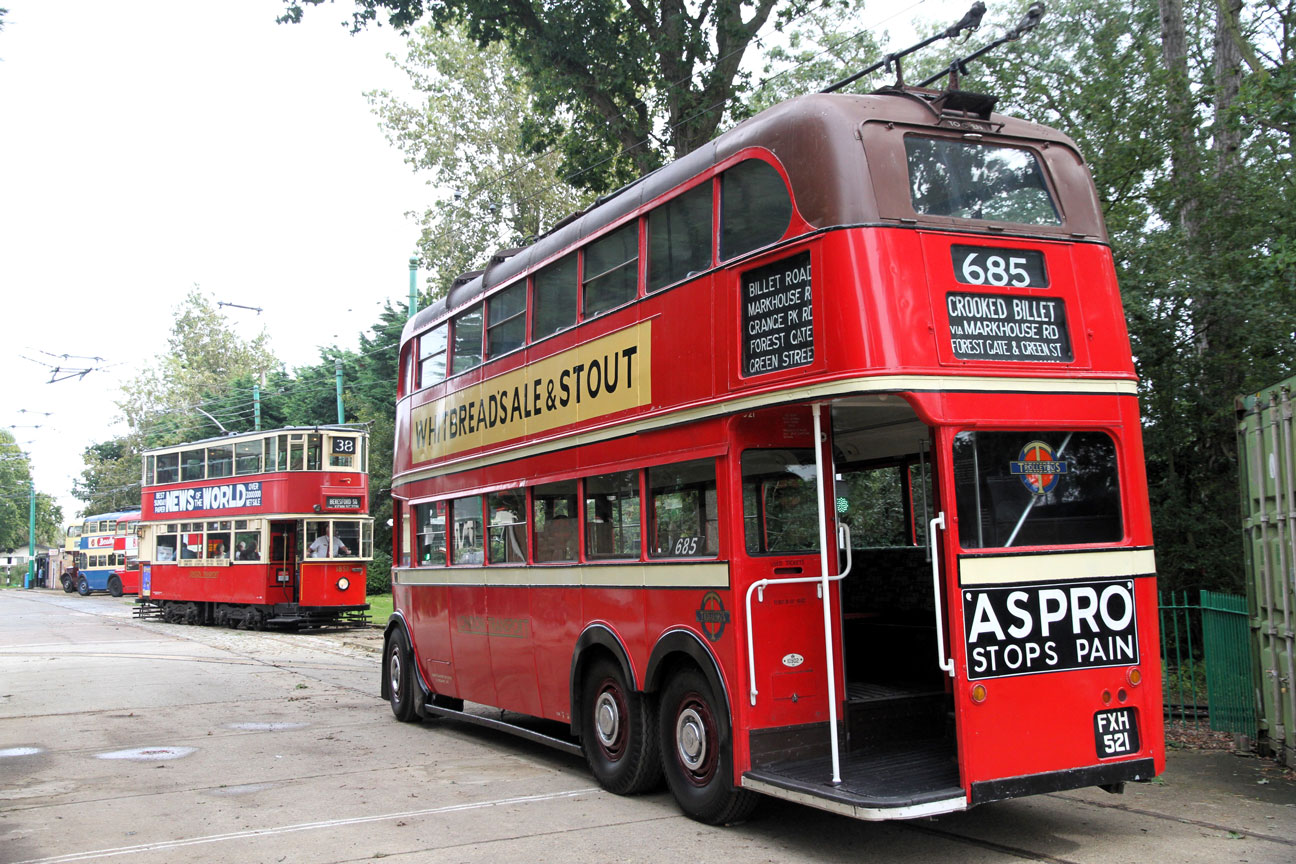 As London trolleybus 1521 looks on, London tram 1858 passes in the background as its about to turn onto the woodland tram route.