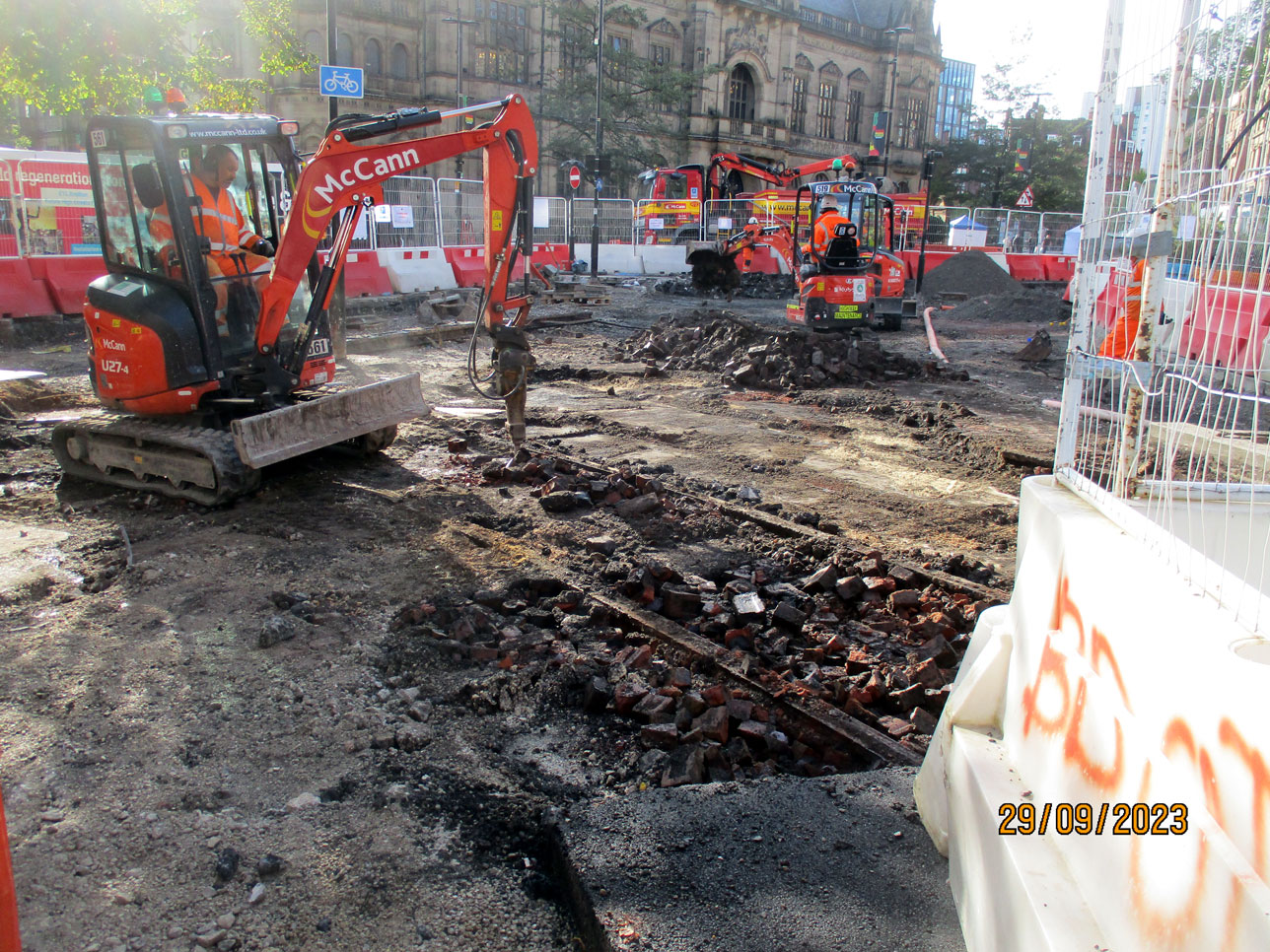 Unmistakable in the centre of the photo are the old tram tracks which have been uncovered.
