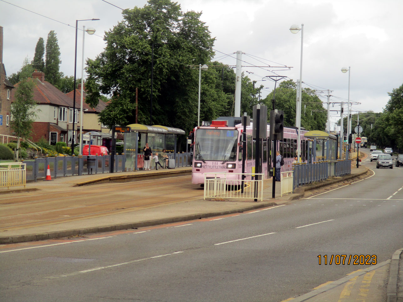111 stops at Hollisend with a service to Halfway on the Blue route. The tram is one of two in an advert for Pretty Little Thing. (All Photographs by Stuart Cooke, 11th July 2023)