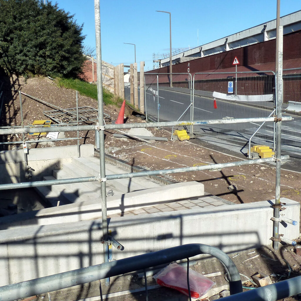 A bright and sunny October day in Blackpool for this photo which shows the ramp and steps leading down to the level of the tram terminus. The subway is under the zebra crossing seen on the road to the left of this shot. (Photograph by Peter Dockerty, 25th October 2023)