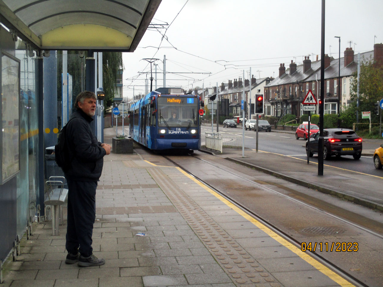 116 pulls into Middlewood with destination display already changed for its return journey to Halfway.