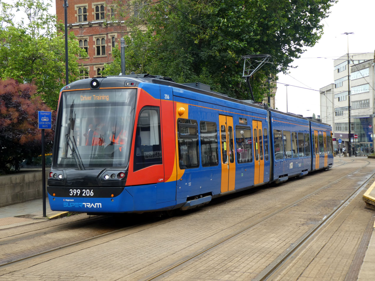 399 206 is one of two Tram-Trains to be fitted with wheel profiles which only enables it to run on the conventional tram network. On this day it was being used for Driver Training as we see in this image of it at Cathedral with it about to reverse.