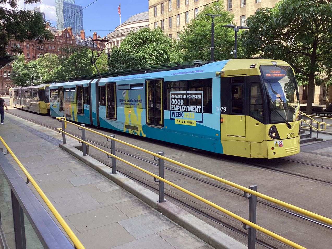 The simple but effective Good Employment Week advert is seen here on 3079 when running as part of a double unit at St Peter’s Square on 20th July. Its working through to Eccles.