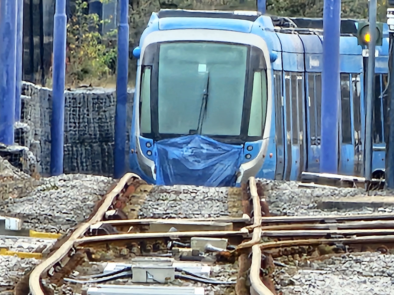 This zoomed image shows 55 in the depot yard at Wednesbury with the damaged section currently protected by the blue tarpaulin (West Midlands Metro blue too!). (Photograph by Michael Morton, 30th November 2023)