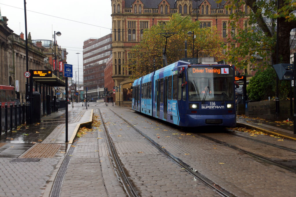 Then on 19th November 2023 we see 116 just departing from Cathedral when being used on Driver Training duties. 116 did start off the year in fleet livery having lost its ad for XPO Logistics at the end of 2022, but from April 2023 it received this advert which is promoting the Park and Ride sites provided at various Supertram stops. (Photograph by David Mee)