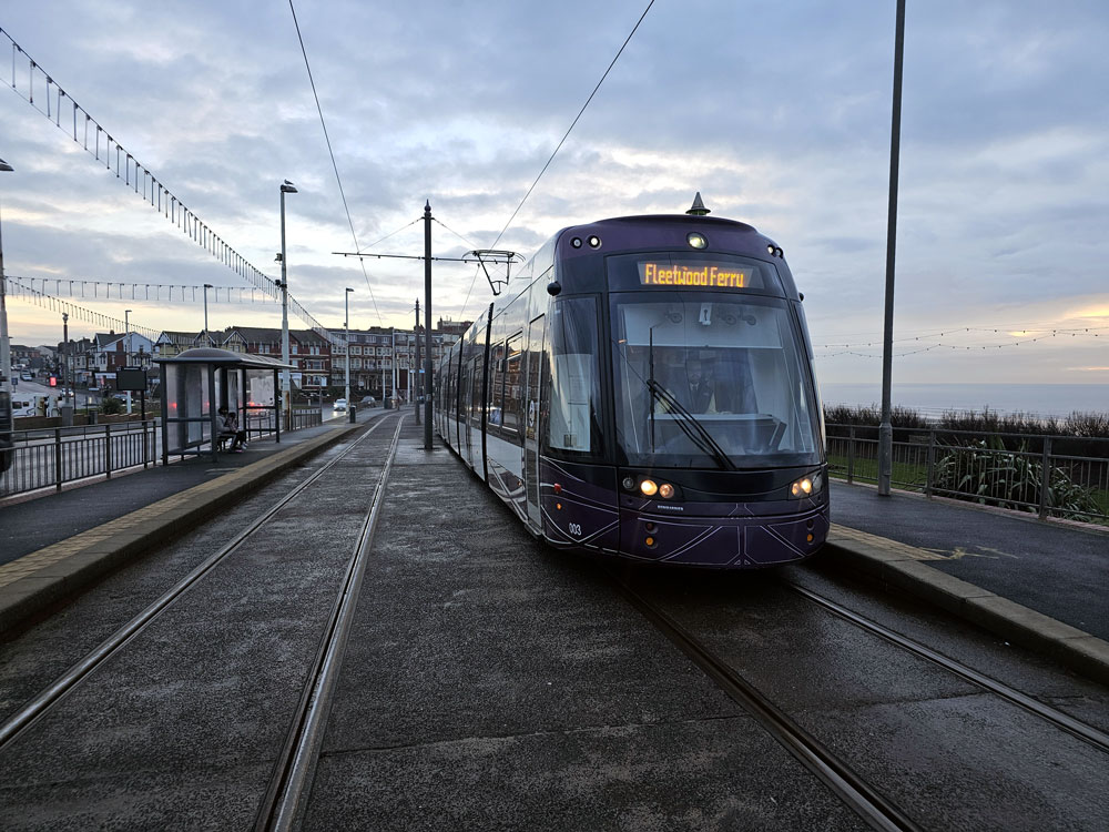 Having received advertising vinyls for Pretty Little Thing back in August 2018, Blackpool Tramway’s Flexity2 003 hasn’t been seen in fleet livery for some time but earlier this month the vinyls were removed to return the tram to the purple and white house colours. A few days after its return to service in fleet livery on 12th December 2023 003 is seen at Gynn Square with a service for Fleetwood Ferry. (Photograph by Michael Morton)