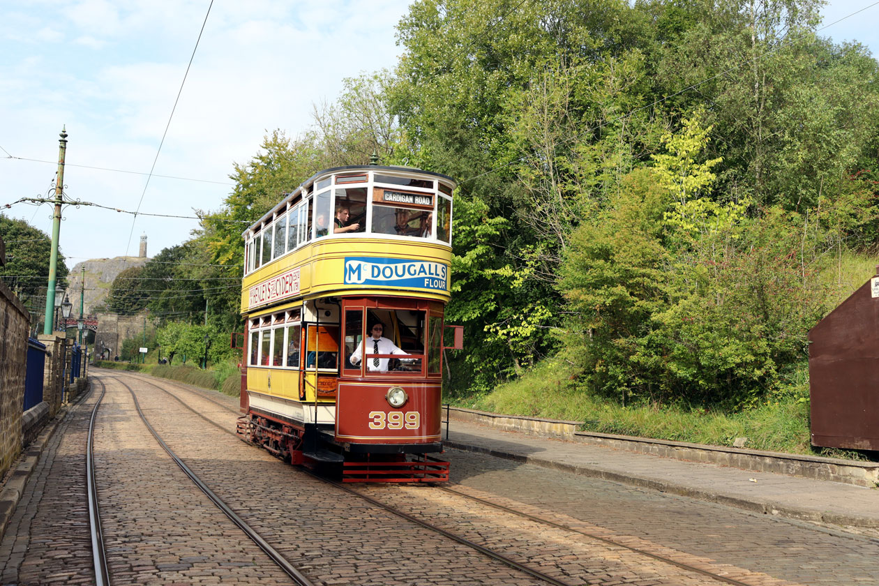 On 16th September 2023 we again see Leeds 399. This time its heading in the opposite direction along the tramway with the Workshop just to the left of where this photograph is taken from. Still with between deck adverts, this time the destination blind has been turned to go to Cardigan Road. (Both Photographs by Gareth Prior)